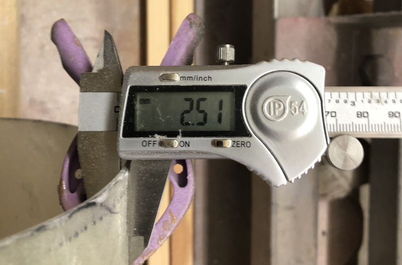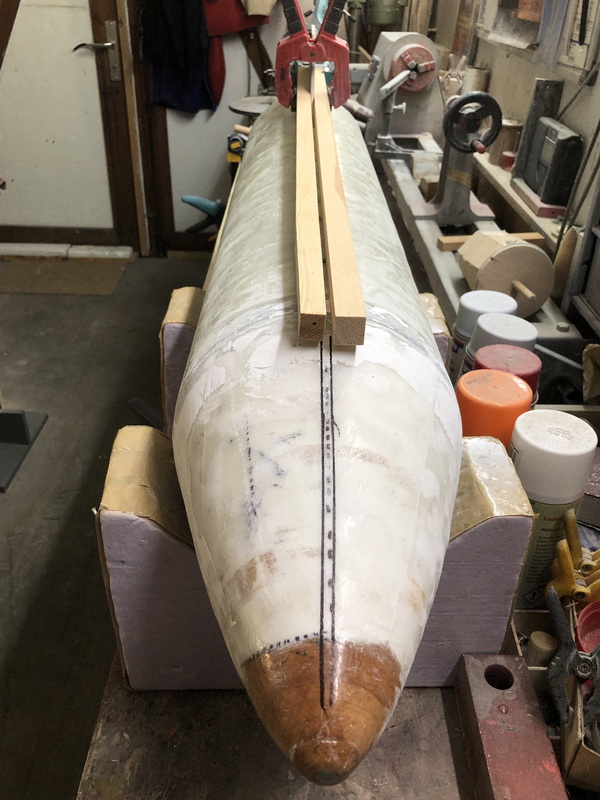 die Wandstärke ist, wie man sieht ca.2,5mm. Beim laminieren habe ich mich bei den Umdrehungen wahrscheinlich verzählt. 2mm hätten da gereicht. Nun, nicht mehr zu ändern. Die Vorflügel habe ich nochmals korrigiert. So sieht es besser aus.