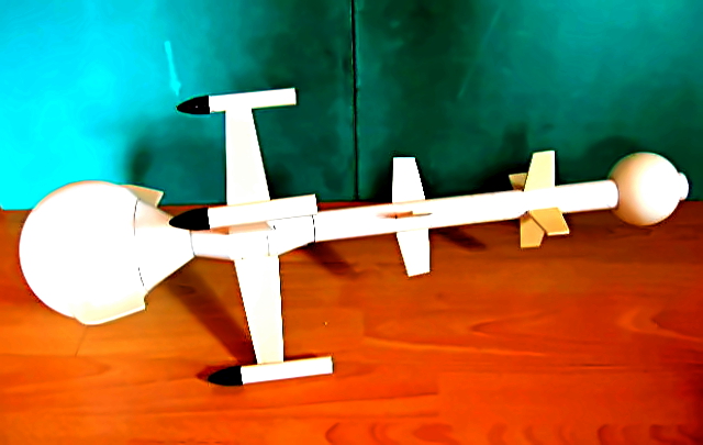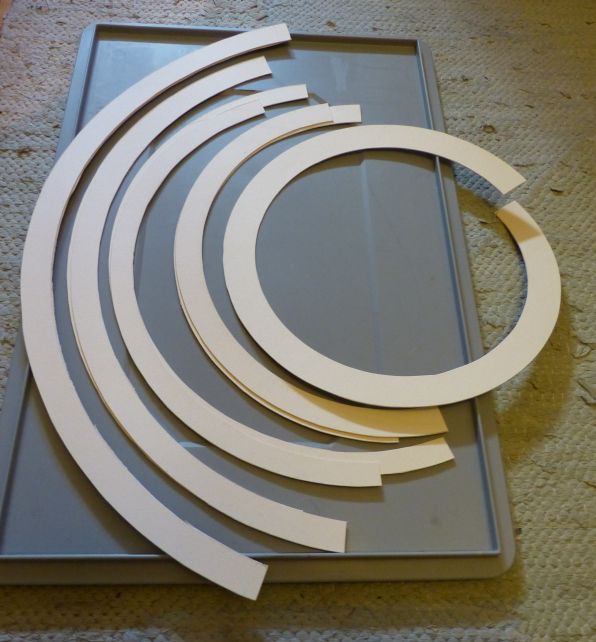 Ich war mit der Form noch nicht so ganz zufrieden. Daher habe ich Streifen aus 1 mm Finnpappe geschnitten: Dazu wieder die Konusberechnung mit der schon oben erwähnten Methode. Das Ganze ist jetzt recht stabil, allerdings hat es auch ein fast schon grenzwertiges Gewicht. Zusammen mit den aufgeklebten Halbkugeln sieht es jetzt so aus: