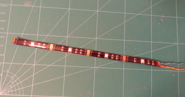 Die Wirkungsweise des Thule-Tachyonators soll mit Licht, das seine Farbe verändert, verdeutlicht werden. Dazu besorgte ich mir im Baumarkt eine RGB-LED-Lichtleiste (meine ist von Paulmann): Die ganze Leiste hat 2 * 8 LEDs. Ich habe vier davon abgeschnitten. Man sieht sehr schön, wo man die Kontakte durchschneiden kann. Es sind auch schon LEDs für die Positionslichter angeklebt: - grün für die rechte Seite (beim Boot wäre das Steuerbordlicht) - rot für die linke Seite (beim Boot Backbordlicht) - weiß für hinten (beim Boot das Hecklicht) Flugzeuge haben dann noch sogenannte Strobe-Lichter; die blitzen immer in kurzen Abständen auf. Die sind auch schon dran. Eine Elektronik soll folgendes leisten: - Blitz-Impuls für die Strobe-Lichter erzeugen - Farbe der LEDs für den Thule-Tachyonator durch alle Regenbogenfarben und Weiß variieren.