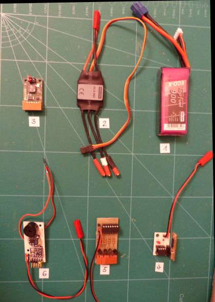 Das muss an Elektronik-Teilen untergebracht werden: 1: Lipo 11,1 V 2: Brushless Motor-Regler 3: Altimax Simply zur Bergung 4: Empfänger für 433 MHz 5: LED-Steuerung (Positionslichter, Strobe-Licht, Thule-Tachyonator) 6: mein WaRa-Altimeter AltiWR Der Motor wird nicht einfach angeschaltet, sondern wird - vom AltiWR - in einer bestimmten Weise hochgefahren. Durch Versuche mit einem Servo-Tester wurde die Methode des Hochfahrens ermittelt. Der AltiWR bekommt daher eine spezielle Software. Er ist ja mit der Standard-Software in der Lage, die Höhe zu bestimmen - somit auch Start und Landung festzustellen - und Servos zu steuern. Der Brushless Motor-Regler wird wie ein Servo mit PWM (Pulsweitenmodulation, wie üblich bei Fernsteuerungen) bedient. Das Layout des Empfängers für 433 MHz wurde vor kurzem geliefert. Ich habe es mit Fritzing erstellt.