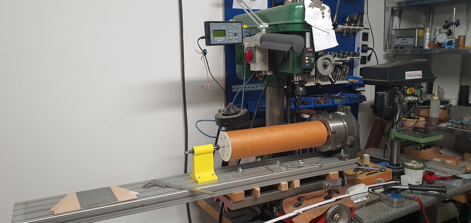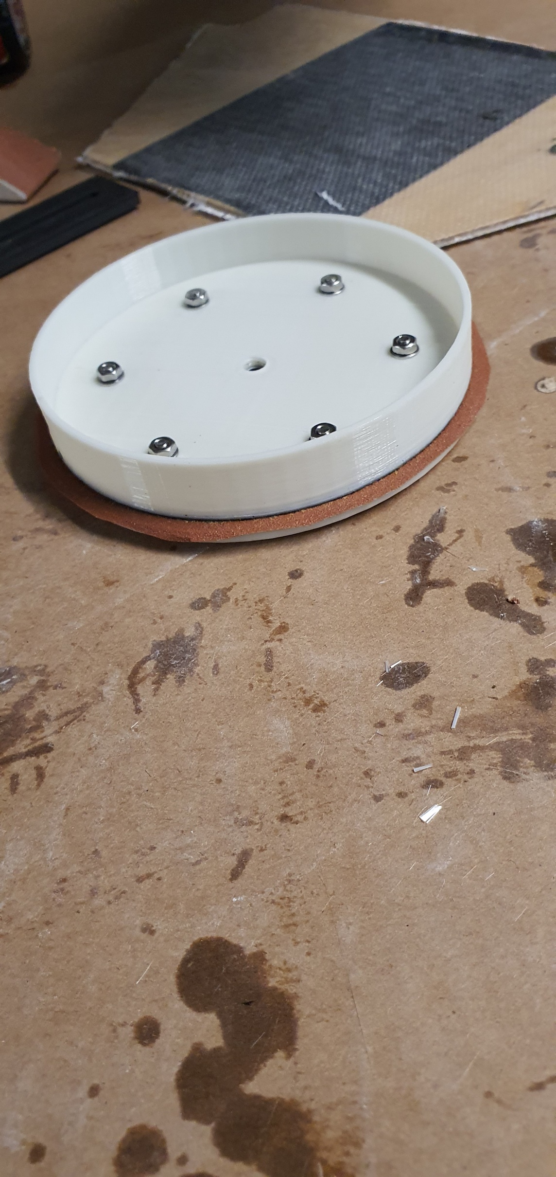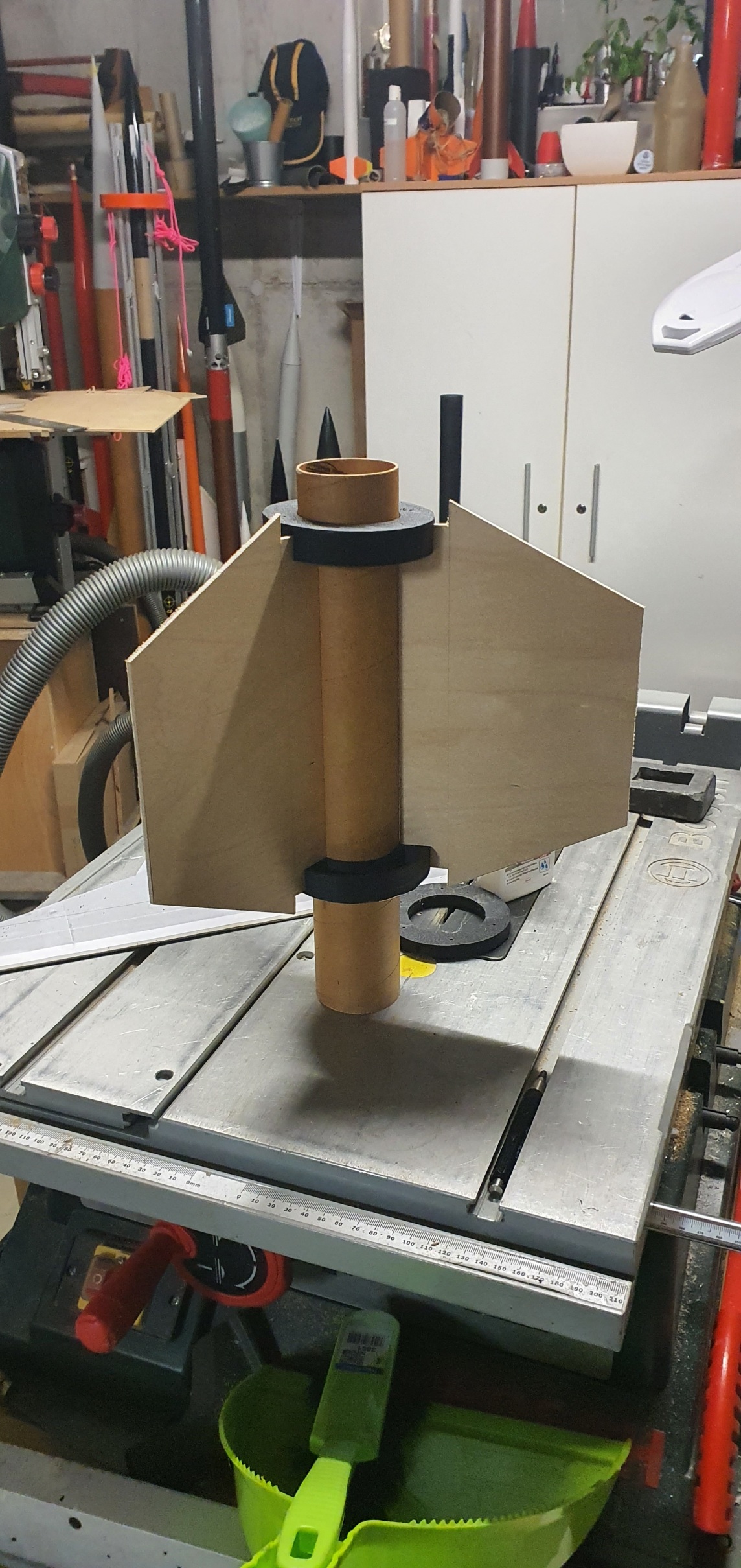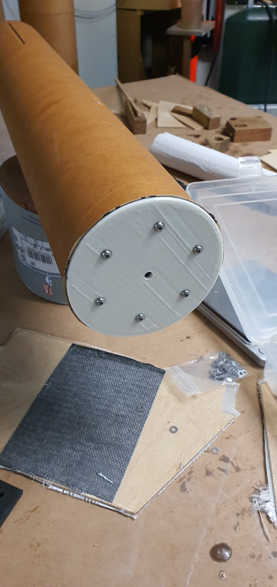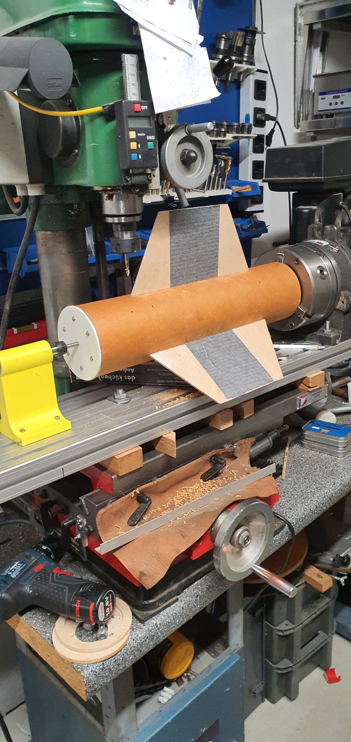Um das Rohr zum Schlitzen Aufspannen zu können, habe ich einen zweiteiligen Bulkhead gedruckt. Zwischen den beiden Hälften ist Schleifpapier. Dann kann ich mit dem Dingen, die Kante vom Rohr nach dem Ablängen gleich winklig schleifen.
