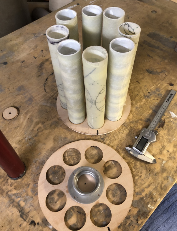 Nun weiterhin Bilder und der Baufortschritt. mittlerweile trocknet das 8. Motorrohr. die nächste große Tube brauche ich für den Schubring und für den Kuppler, d.h. Verbindung zum nächsten Rohr, bis zur E-Bay. |