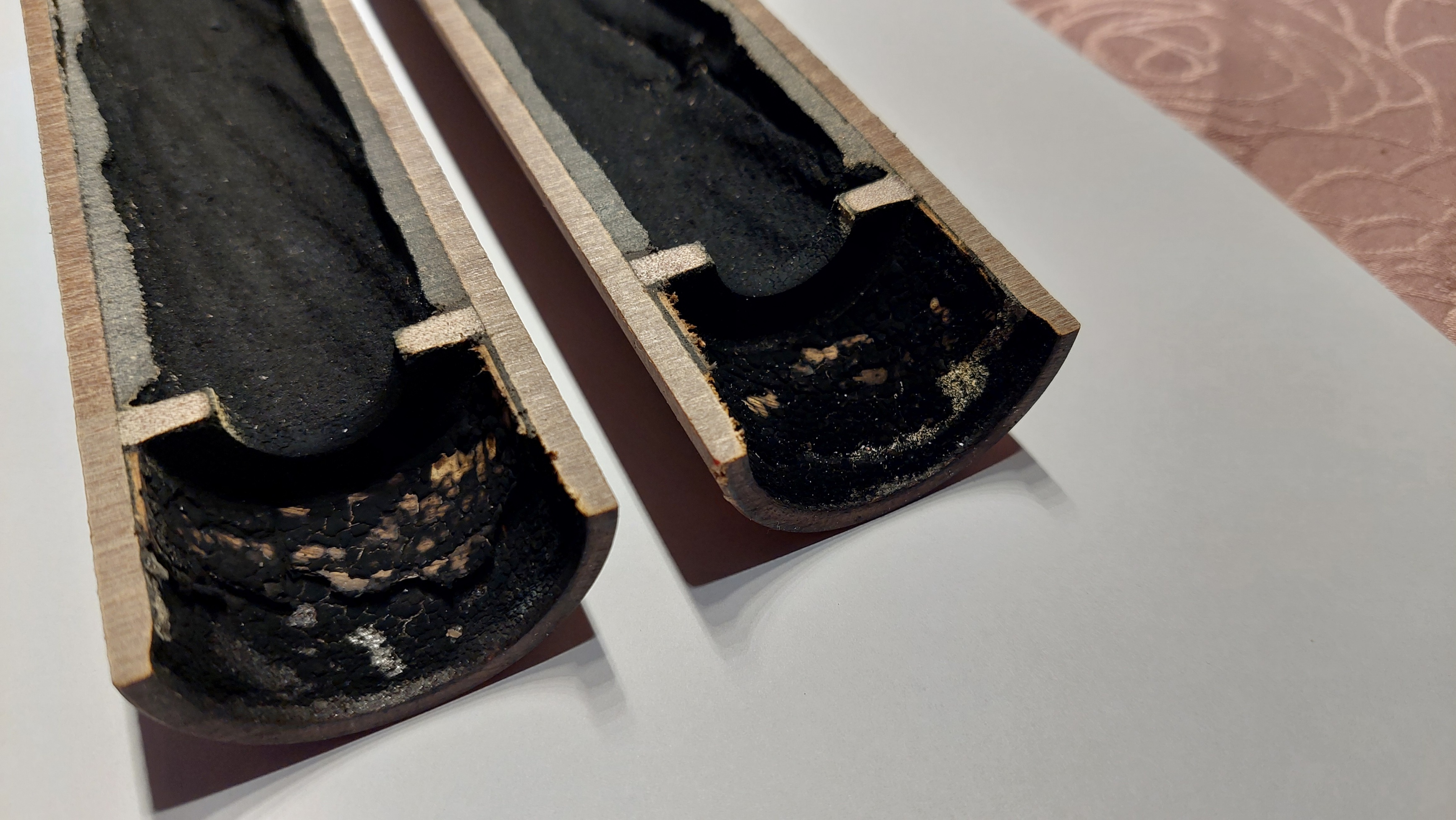 Hier die Grains des Motors, bestehend nur aus Epoxy (Klebstoff) und Paraffin (Kerzenwachs)vor dem einkleben in den Liner... Fotos von Ralf Und hier nach dem Flug (aufgesägter Reload) Schön zu sehen die sehr gut funktionierende Nachbrennkammer und der doch recht deutliche Abbrand des Treibstoffes...