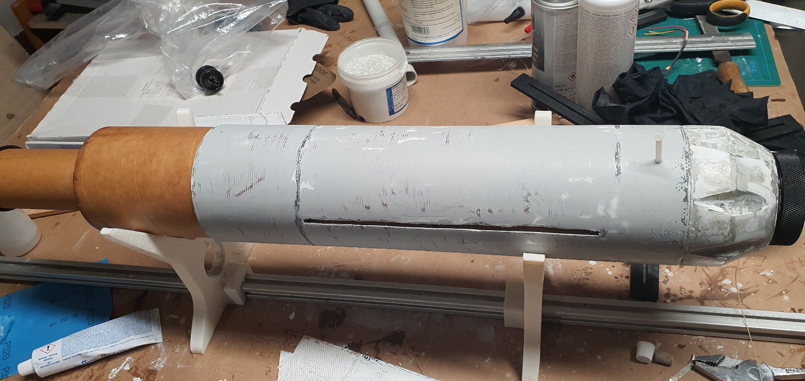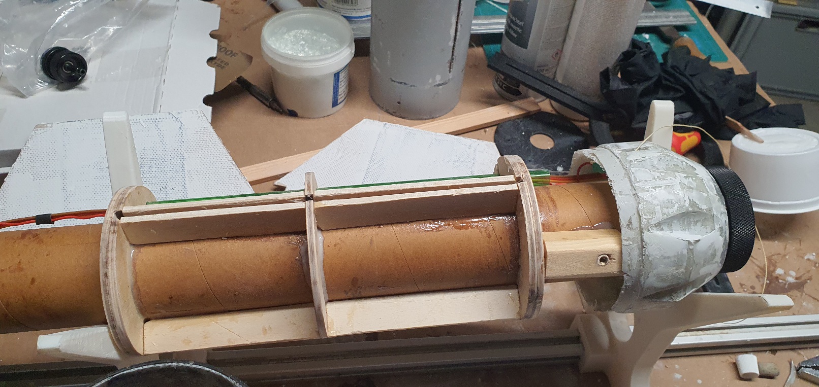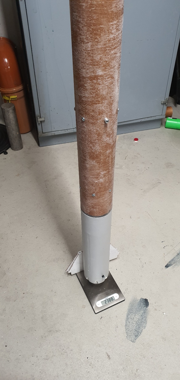 Ich muss noch den Kuppler verstärken und die Rohre schleifen, dann kann ich das Modell zusammen kleben. Die untere Sektion wird mit dem oberen Körperrohr verschraubt. Das macht das Handling mit Hybridmotoren einfacher, hoffe ich. Das angestrebte Leergewicht ohne Motor liegt bei 2800g. Da muss ich mir warscheinlich noch etwas sinvollen Ballast suchen.